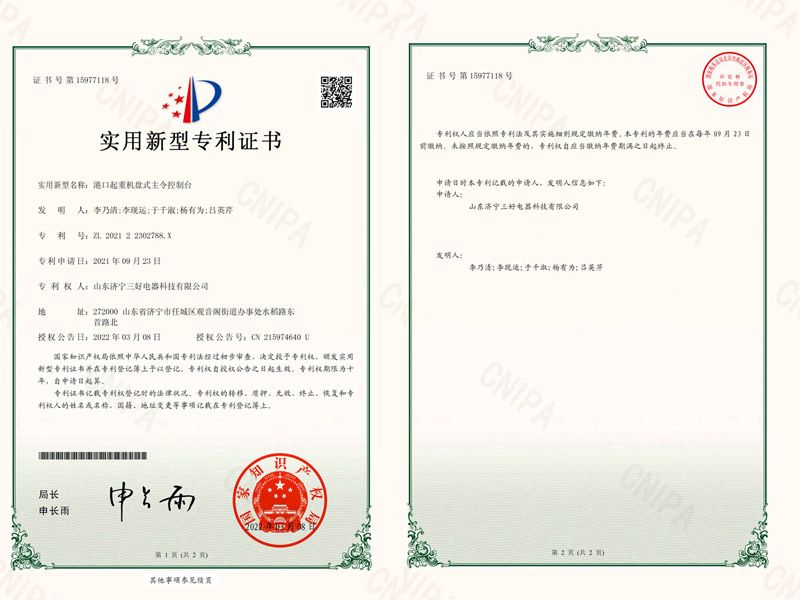 港口起重機(jī)盤(pán)式主令控制臺(tái)專(zhuān)利證書(shū)