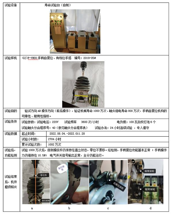 2022年下半年,由于<SJ>P-VNSO操縱桿技術(shù)已成熟,產(chǎn)品已過關(guān)。為了盡快驗(yàn)證產(chǎn)品使用壽命能否達(dá)到設(shè)計(jì)目標(biāo),需要通過臺(tái)架帶電負(fù)荷壽命試驗(yàn)來驗(yàn)證。按照設(shè)計(jì)機(jī)械壽命1000萬次,電壽命800萬次的目標(biāo)進(jìn)行考核。隨機(jī)從批量生產(chǎn)的產(chǎn)品中抽出一臺(tái),有檔位手感、手柄自復(fù)位機(jī)型進(jìn)行了臺(tái)架試驗(yàn)。